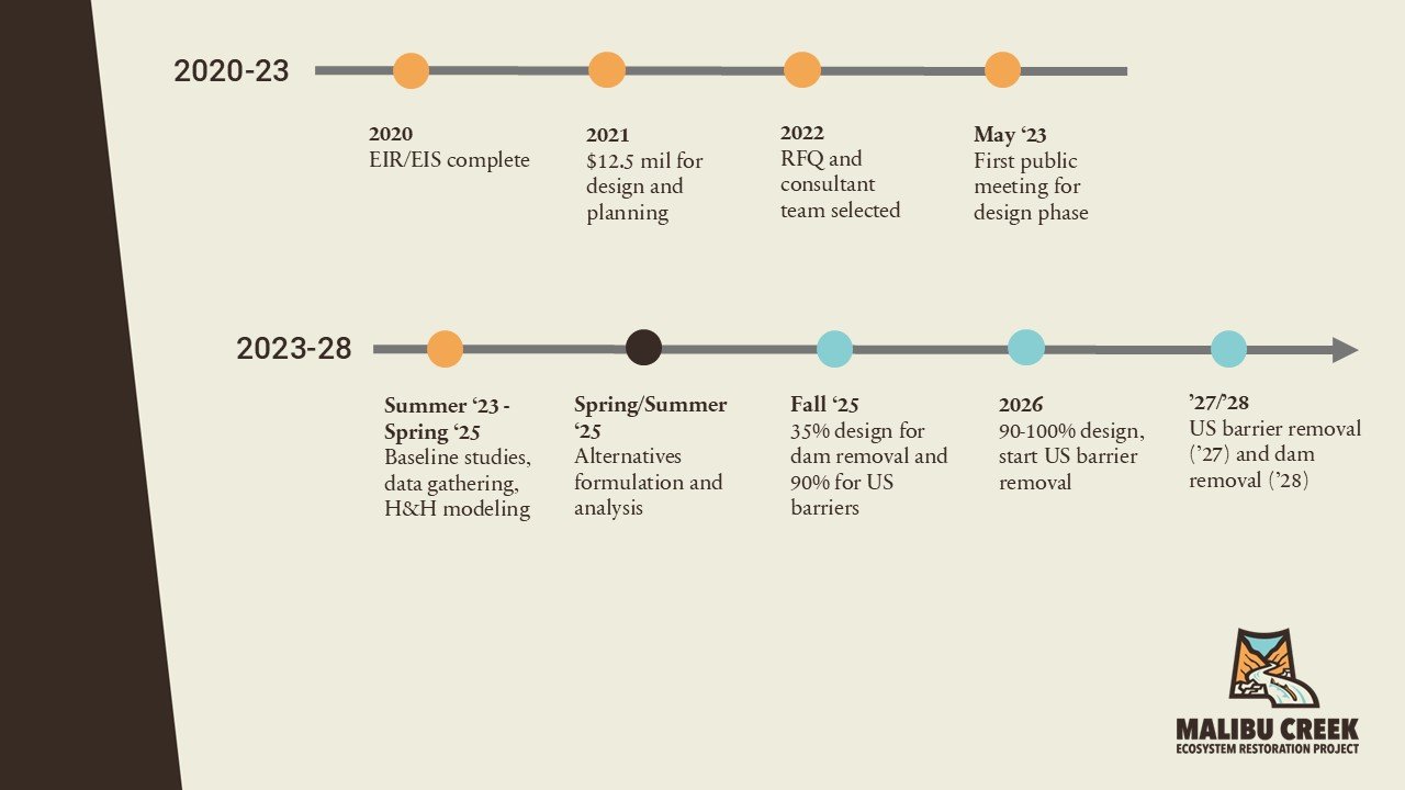 California State Parks and the project team further analyzed removal methods of the 100-foot tall dam and remediation methods of eight upstream barriers. Their findings determined that much of the trapped sediment behind the dam can be repurposed for beach nourishment or stored for future use, which helps build coastal resiliency and will also lower project costs.