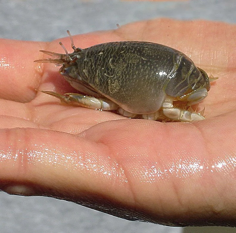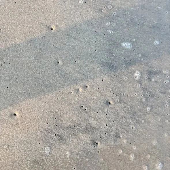 At the shoreline you’ll also find sand dwellers such as pacific mole crabs (aka sand fleas) and bean clams that dig into the saturated sand. Sand crabs often gather in feeding groups in the swash zone, where waves wash up and down and also where sediment transport and coastal processes take place. The tiny holes or V-shaped ripples in the sand you might see are caused by wave wash flowing over the crab’s antennae. Shaped like small eggs and growing up to 1.5-inch long, these critters spend their lives following the tides in order to remain shallowly buried. Digging into the sand backwards, they can bury themselves completely in less than 1.5 seconds. Unlike most crabs, they have no claws and eat plankton caught in their antennae.